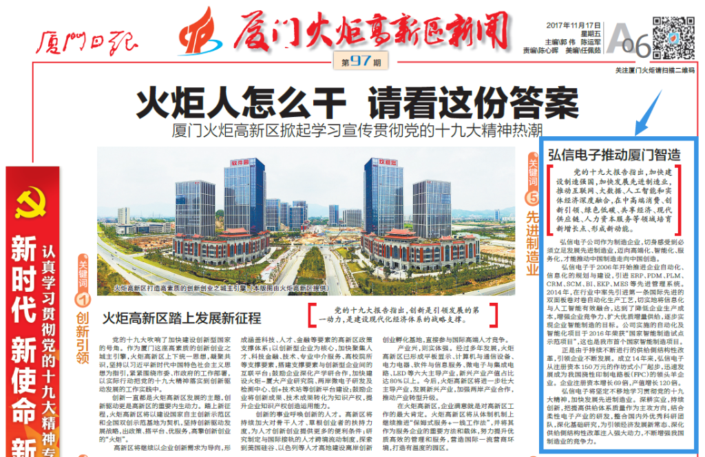 弘信電子將堅定不移地學習貫徹黨的十九大精神,加快發(fā)展先進制造業(yè)。深耕實業(yè),持續(xù)創(chuàng)新,把提高供給體系質(zhì)量作為主攻方向,結合柔性電子產(chǎn)業(yè)的研發(fā),整合國內(nèi)外優(yōu)秀科研團隊,深化基礎研究,為引領經(jīng)濟發(fā)展新常態(tài)、深化供給側(cè)結構性改革注入強大動力,不斷增強我國制造業(yè)的競爭力。